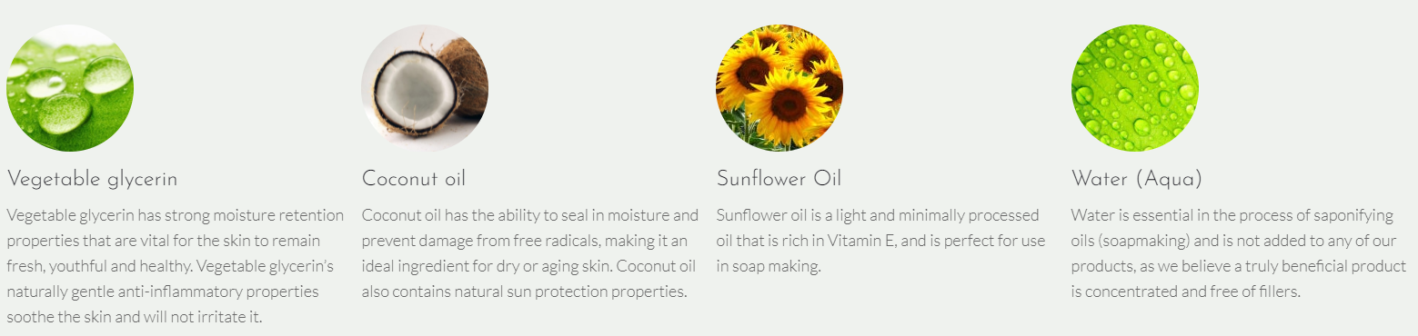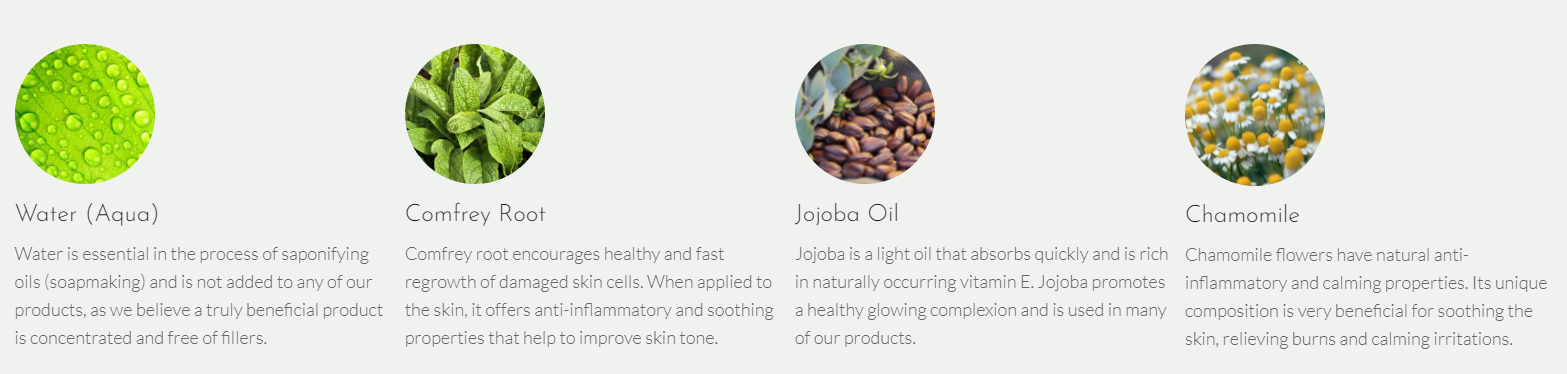 Vegetable Glycerin*, Saponified Organic Oils (Sunflower Oil*, Coconut Oil*, Water, Potassium hydroxide, Citric Acid), Comfrey Root Powder*, Jojoba Seed Oil*, Blue Chamomile Oil*